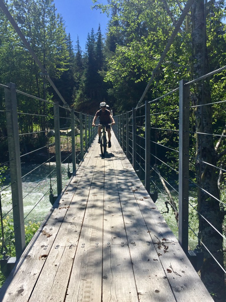 Route notables: Technically easy double-track trail riding on crushed gravel. Good variety of forest scenery including multiple river crossings on suspension bridges. Sea to Sky Trail continues S to Squamish. It employs HWY 99 a couple times further S but is a great longer ride on easy trails. Solid details available at: