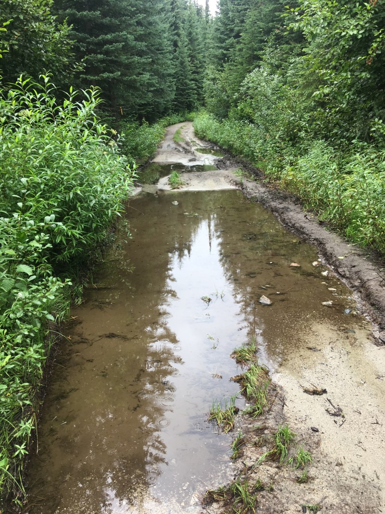 Scattered showers made for wet trailside vegetation but also a trail void of people. I wore rain gear at the front and moved slowly using poles to knock moisture off foliage. This is slow moving but a welcomed pace for the knee and a good way to keep your sherpa dry. Gen opted for a shell and gaters at the rear and we both arrived relatively dry.