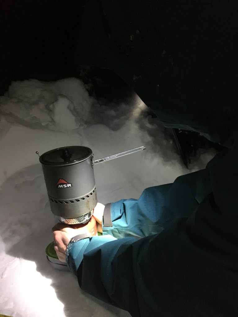A sheltered kitchen will improve comfort but also the efficiency of your stove. Keeping your fuel as warm as possible also drastically increases speed and fuel efficiency. When it’s super cold putting the fuel in your sleeping bag or pants before use can make a big difference. Even transferring body heat by touch can be very effective if tolerable.