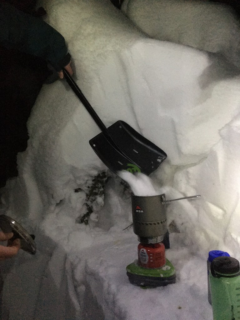 Often there is no running water available at which point melting snow is the game. This is an art which gets easier and again good to practice before heading into the field. Choosing fresh storm snow devoid of needles, old mans beard and animal faces is obvious. Selecting a “kitchen” location sheltered from wind and close to your snow mine is key. Consider the size of your stove in relation to your shovel scoop to avoid unwanted overflow.
